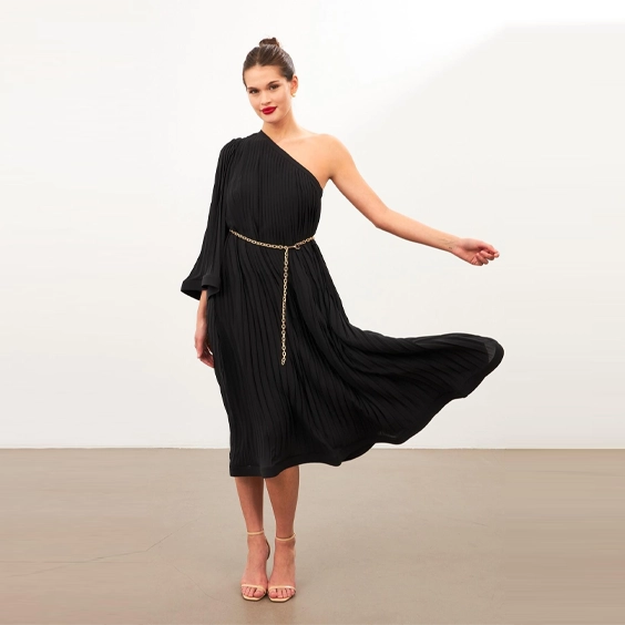 Asimetrik kesimi ve drapeli detaylarıyla dikkat çeken bu elbise, feminen çizgileri zarif bir şekilde yansıtır. İnce altın kemer detayı, elbiseye sofistike bir dokunuş katıyor.